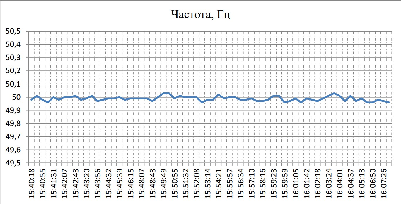 Контроль частоты сети при проведении активного эксперимента показал незначительные изменения от 49,96 до50,03 Гц, что соответствует допустимым пределам, обозначенным в ГОСТ 32144-2013. На рисунке 4 представлен график изменения частоты.