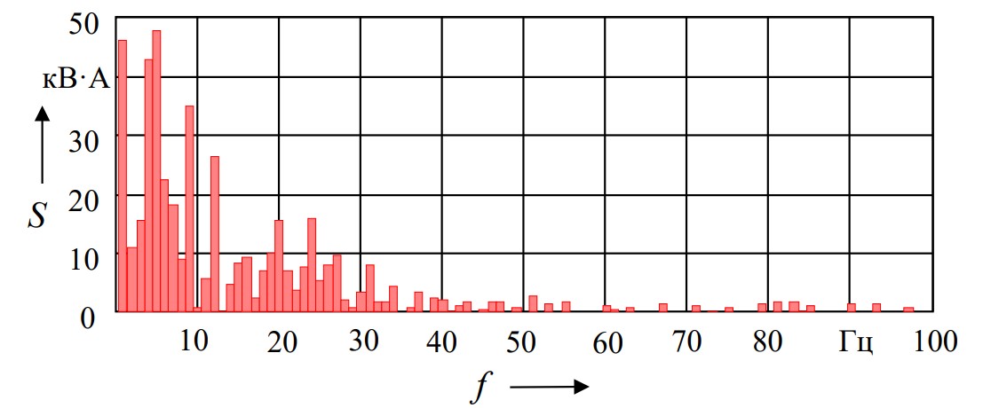 При этом инерционность систем управления параметрами режима электрической сети на основе полупроводниковых преобразователей, как правило, не превышает 0,02 с. Таким образом, оцениваемая высшая частота графика нагрузки Tв = 40 Гц, низшая – 0,016 Гц.