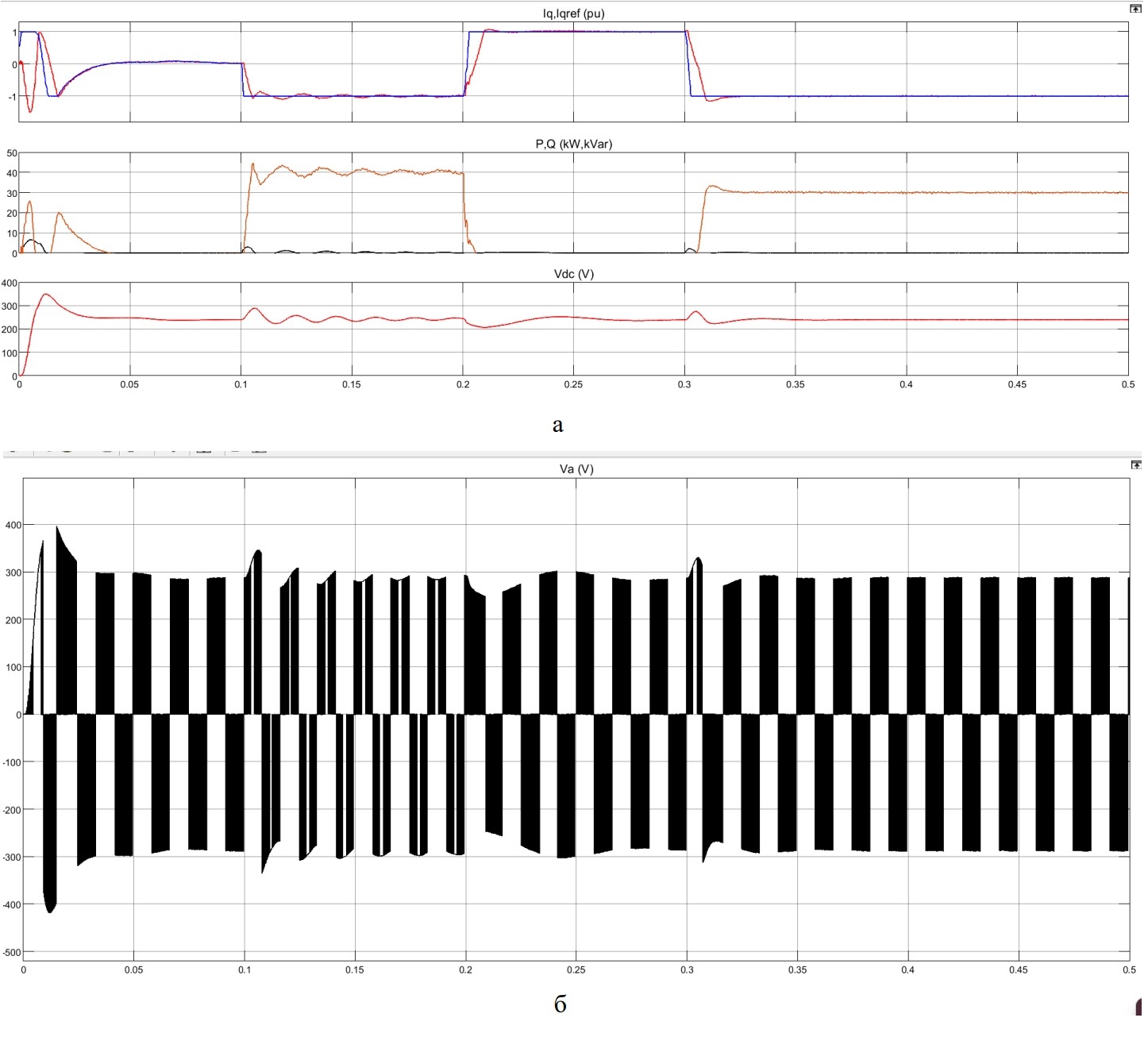 Рисунок 9 – Временные диаграммы работы СТАТКОМ по условию стабилизации напряжения и осциллограмма ШИМ