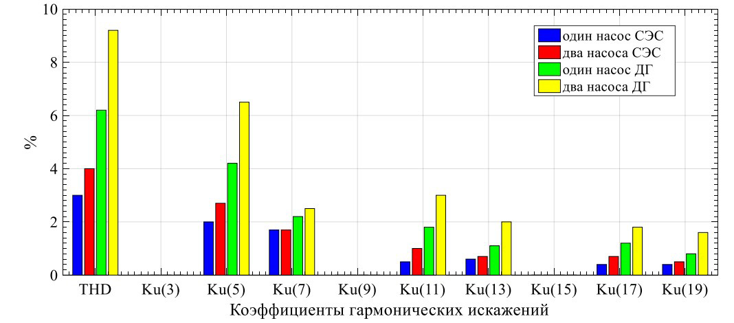 В работе [1] приводятся результаты измерения коэффициента суммарного гармонического искажения KU (THD) и коэффициентов n-ных гармонических составляющих напряжения KU(n) при работе частотно-регулируемого электропривода насосов котельных при условии питания от централизованной системы электроснабжения и для случая питания от дизель-генератора (рисунок 1 – привод. по [1, с. 143]).