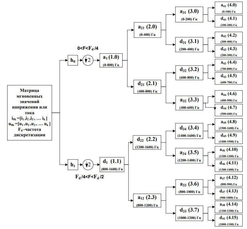 Для расчета уровней токов высших гармоник, а также значений активной и реактивной мощности несинусоидального режима следует произвести пакетное вейвлет-разложение сигнала тока и напряжения до глубины 4 уровня в соответствии с деревом вейвлет-разложения, представленным на рисунке 8.