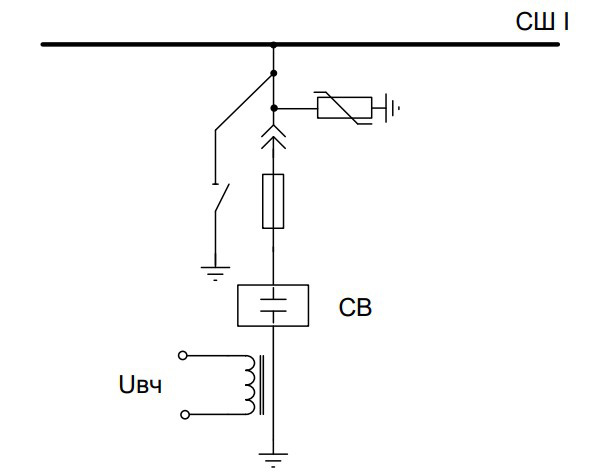 Схема подключения устройства селективного определения представлена на рисунке 2. Генератор непромышленной частоты (Uвч) через согласующий трансформатор и разделительные конденсаторы (СВ) подключается к шинам подстанции (СШ I). На каждой фазе отходящих линий необходимо установить датчики тока на ферритах, которые позволяют измерить действующее значение тока непромышленной частоты.