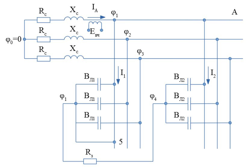 Представим численный расчет режима сети с целью обоснования требуемой селективности определения линии с однофазным замыканием на землю. Произведем расчет для схемы распределительного устройства (рис. 2) с двумя отходящими линиями длиной 10 км, схема замещения которого представлена на рисунке 3. Исходные данные для расчета представлены в таблице 1.