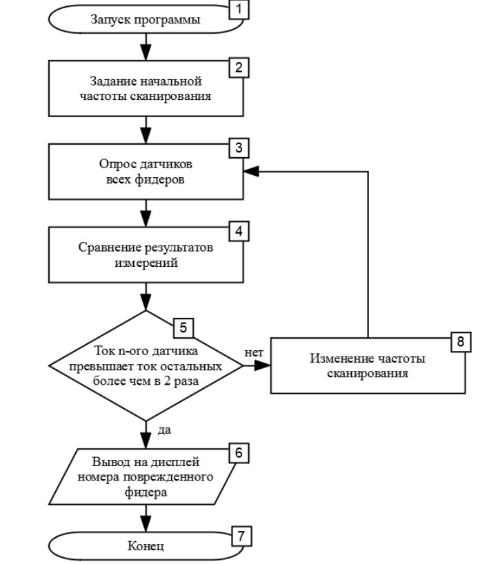 На основе использования метода стоячих волн был разработан алгоритм (рис. 6) работы устройства определения расстояния от подстанции до места ОЗЗ. Алгоритм обеспечивает автоматическую работу устройства без участия персонала.