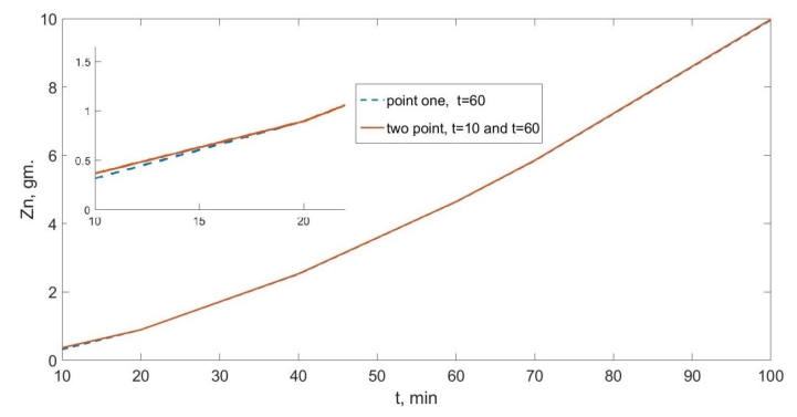 Также было проведено исследование влияния количества взятых точек и показано, что оно не оказывает решающего влияния на погрешность. В работе [15] этот вопрос исследовался для процессов выделения вещества в газовой фазе, когда применялось приближении неизменности и однородности площади электрода. Процесс отложения цинкового осадка на электрод показан на рисунке (1). На нем приведено сравнение рассчитываемых данных при силе тока 500А в двух случаях: расчеты приводились по одной точке t = 1 час, и по двум точкам (t = 1 час и t = 10 мин).
