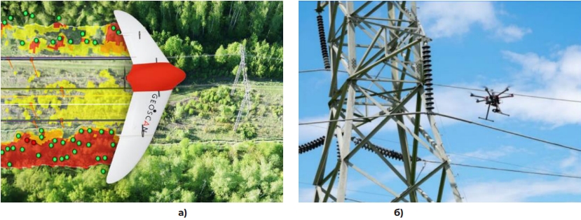 БПЛА, учитывая технические преимущества, являются универсальными инструментами для осуществления диагностики электроустановок. Использование БПЛА является эффективным средством для мониторинга электроустановок, в том числе, диагностики состояния элементов ЛЭП. Анализ мировых трендов свидетельствует о том, что область применения БПЛА для выполнения функций мониторинга в отрасли электроэнергетики постоянно расширяется. На сегодняшний день устойчиво формируются предложения по обследованию элементов ЛЭП при помощи БПЛА различных типов. Для диагностики воздушных ЛЭП уже активно используются БПЛА самолетного (рис. 1 a) и вертолетного типа (рис. 1 б) [3].