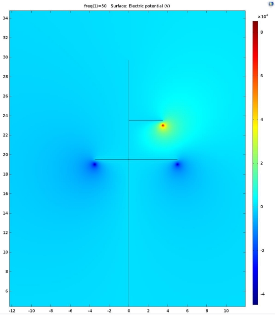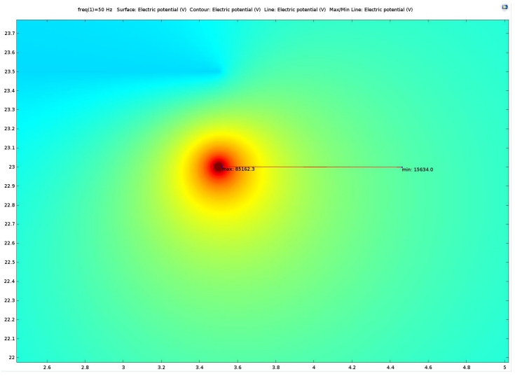 Рисунок 2. Потенциал электрического поля около опоры ЛЭП 110 кВ.