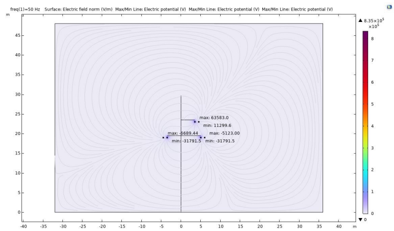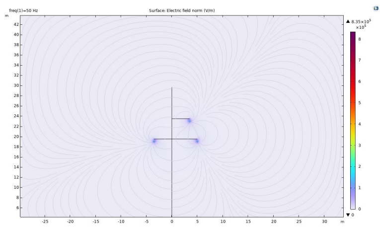 Рисунок 4. Напряженность электрического поля вблизи опоры ЛЭП 110 кВ.