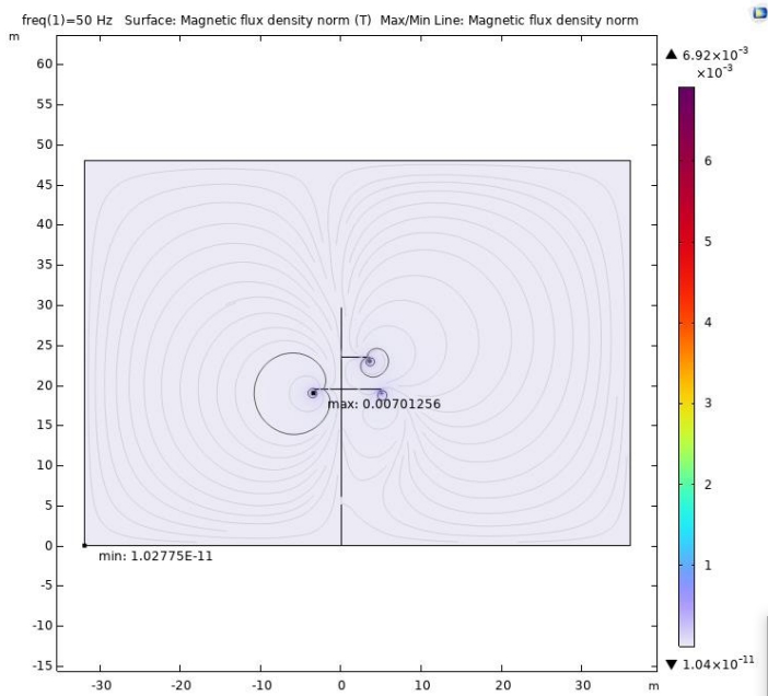 Рисунок 6. Плотность магнитного потока около ЛЭП 110 кВ (с максимальным значением).