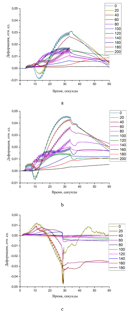 Рисунок 3. Графики внутренних деформаций при удалении от оси лазерного воздействия для: а – «пустого» ПААГ, b – ПААГ с наночастицами Na0.2TiO2, c – ПААГ с наночастицами магнетита