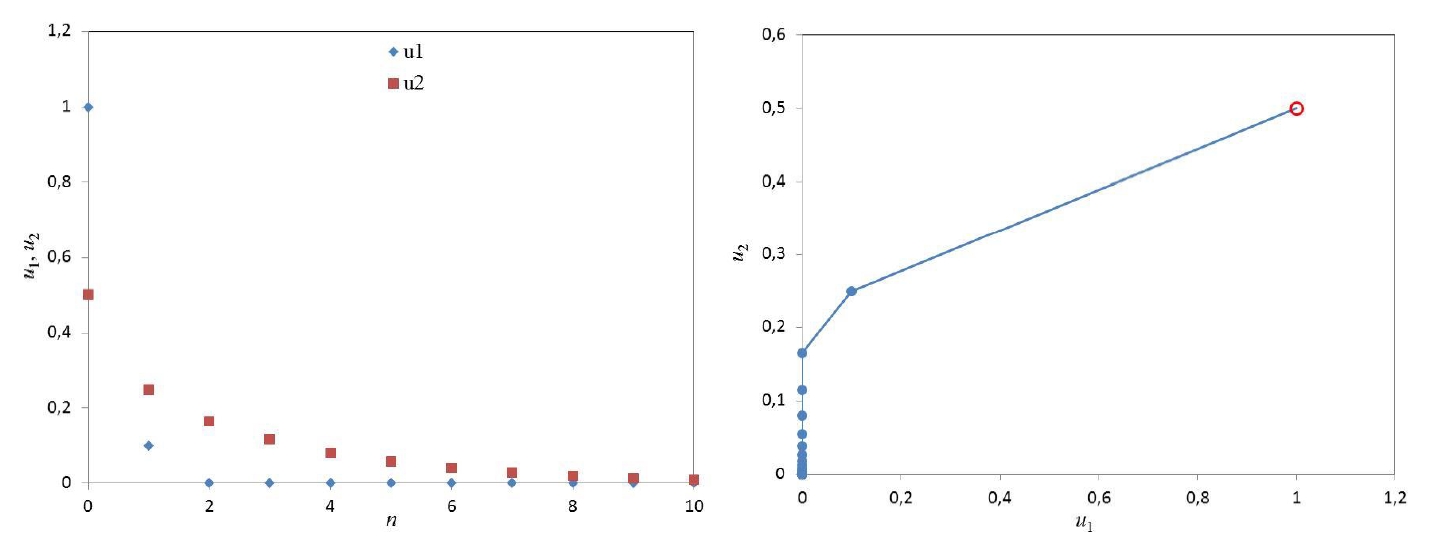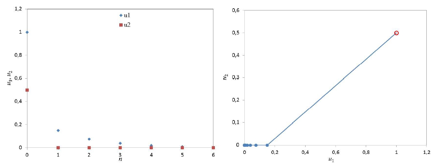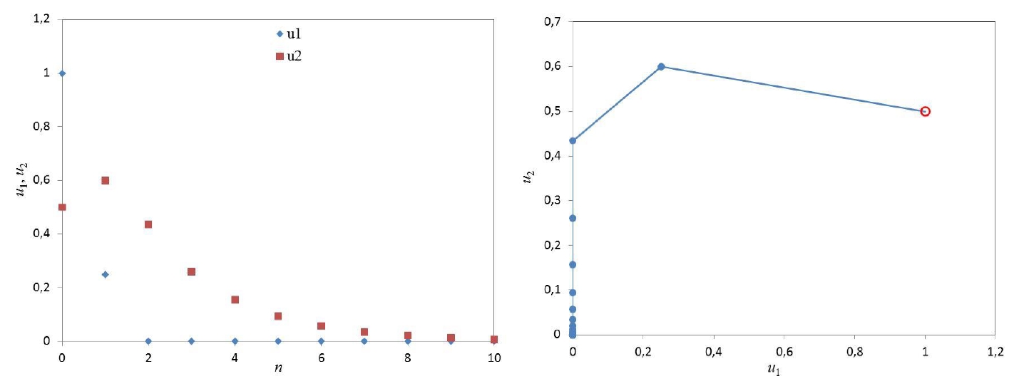 Рисунок 5 – Зависимости и (слева) и фазовая траектория конфликта работник-работодатель (справа) для и (0.5; 0.4)