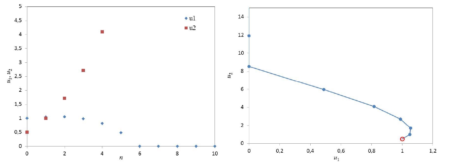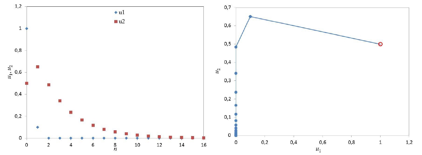 Рисунок 8 – Зависимости и (слева) и фазовая траектория конфликта работник-работодатель (справа) для и (0.671; 10.18)
