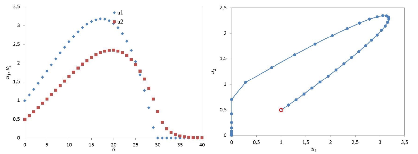 Рисунок 4 – Зависимости и (слева) и фазовая траектория конфликта работник-работодатель (справа) для и (0.5; 0.4)