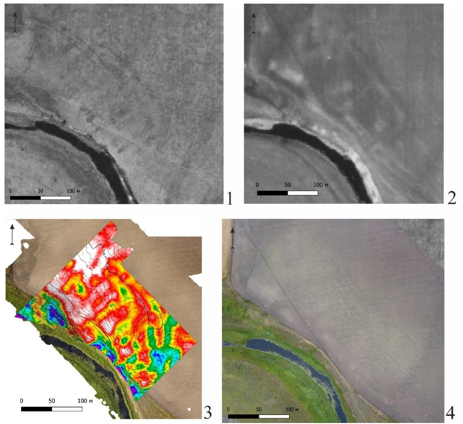 Рисунок 3 – Укрепленное поселение Нижнеуспенское: 1 – фрагмент аэрофотоснимка от 19.06.1956; 2 – фрагмент аэрофотоснимка от 8.05.1980; 3 – карта кажущегося электрического сопротивления; 4 – ортофотоплан, сделанный на основании съемки с квадрокоптера