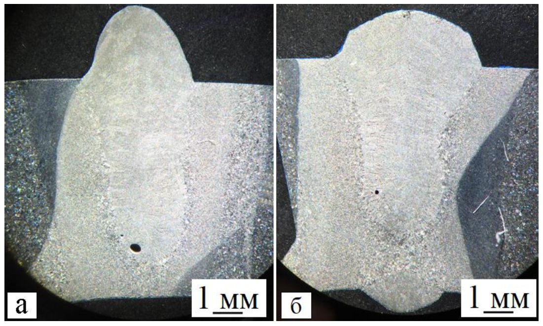 После сварки поверхности образцов шлифовали, а затем полировали. Химическое травление шлифов проводили следующей смесью: HF – 15 см³, HNO3 – 35 см³, H2O – 200 см³, глицерин – 100 см³. Для измерения микротвердости и исследования структуры поверхности образцов использовали твердомер Tukon 2500 (Германия). Во всех экспериментах в качестве защитного газа использовался аргон при расходе 25 л/мин. Сканирующую электронную микроскопию (СЭМ) и элементный анализ проводили на рабочей станции Auriga Cross Beam (Carl Zeiss, Германия). Томографические снимки получены на промышленной рентгеновской системе North Star Imaging X5000 (США). Результаты исследования показали увеличение механических характеристик сварного соединения за счет термообработки и воздействиями ультразвуковыми колебаниями. Таким образом, на микрофотографиях можно видеть, что в процессе формирования наплавочного валика в нижней части наблюдается сужение, и валик вытягивается (рисунок 2).