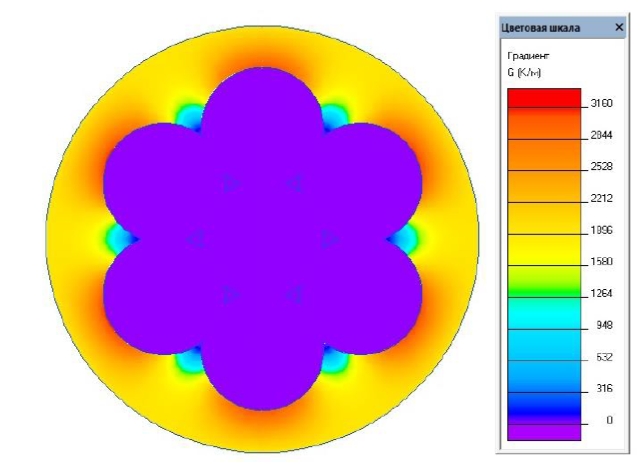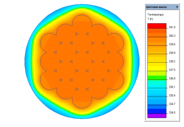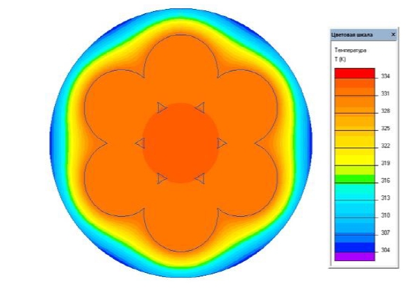 Распределение температуры по сечению провода и градиент температуры в проводе совпадает с аналитическими расчетами, произведёнными в работе [6]. Откуда можно сделать вывод, что при расчете температуры провода жилы можно считать цельнометаллическими и не учитывать число проволок.
