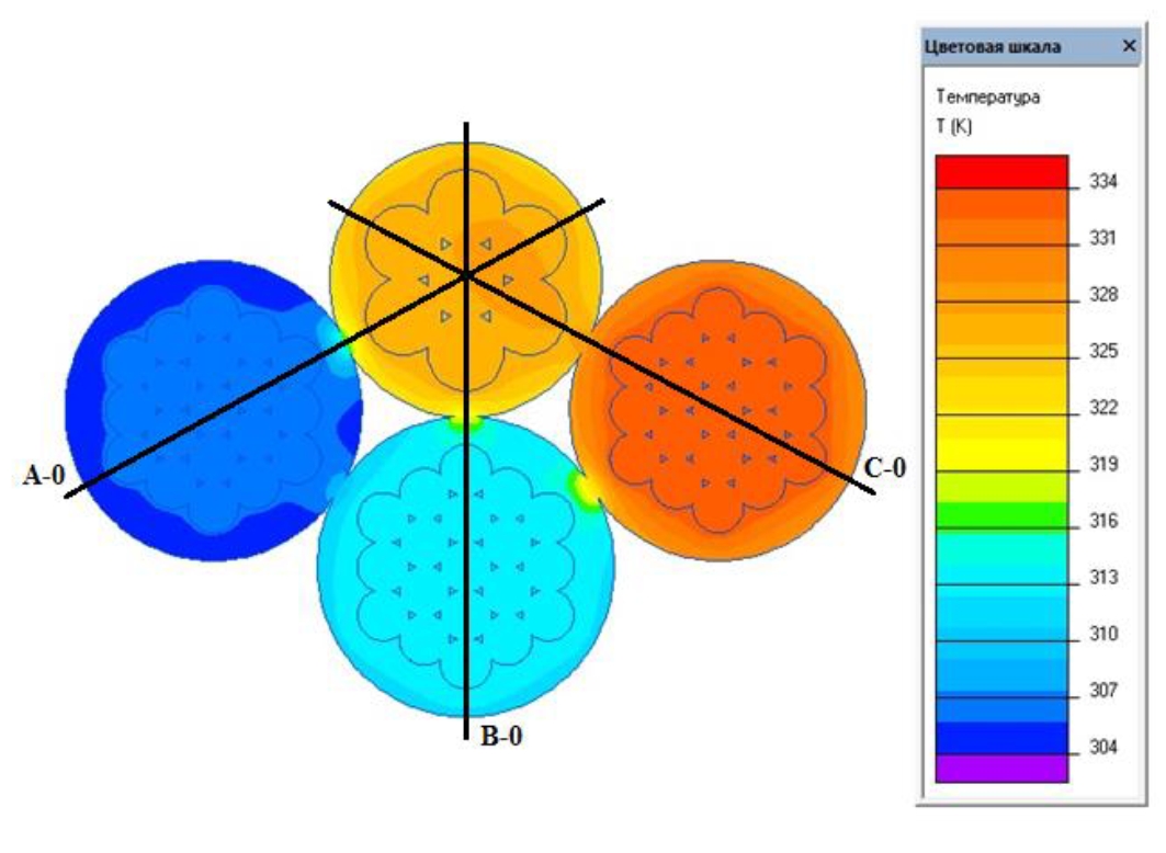 В результате моделирования была получена картина поля. Для анализа взаимного влияния температурных полей при заданной нагрузке были выбраны плоскости А-О, В-О и С-О (рисунок 6).