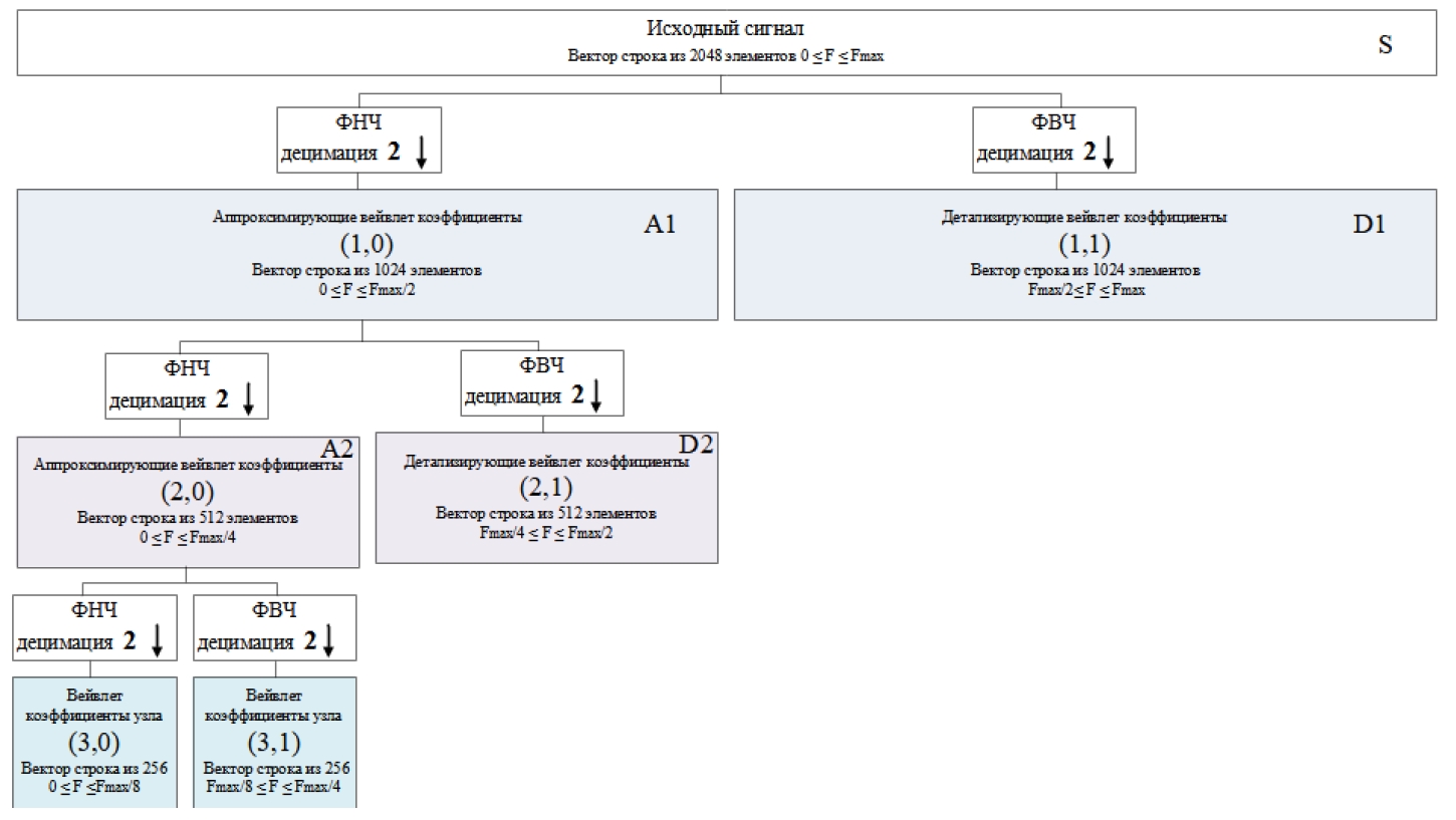 Рисунок 3 – Схема дискретного вейвлет-разложения исследуемого сигнала мощности узла нагрузок до 3 уровня