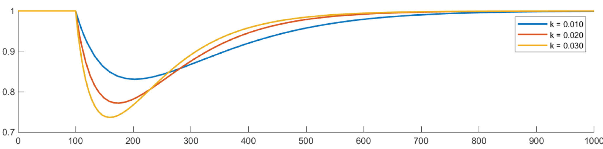 Рост коэффициента аэрации почти не оказывает влияния на начальный участок графика, но ускоряет восстановление концентрации кислорода до нормального уровня на конечном этапе.