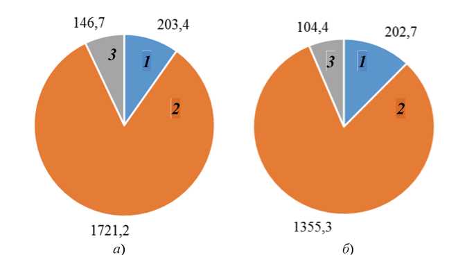 Рис. 2. Деятельность промышленных предприятий с производственными отходами, тыс. т: а – 2021 г.; б – 2022 г.; 1 – обработано; 2 – утилизировано; 3 – обезврежено
