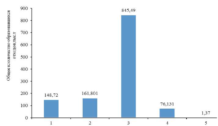Рис. 4. Количество образующихся отходов по классам их опасности для окружающей природной среды на ТВРЗ, т: 1 ‒ 5 соответственно 1 –5 классы