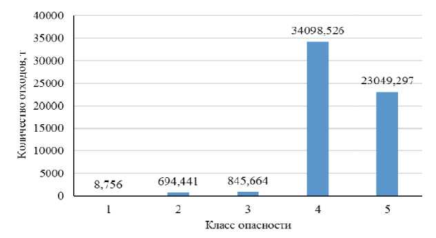 В дополнение к основному виду деятельности, ТВРЗ также имеет лицензию на сбор, транспортирование, обработку, утилизацию, обезвреживание и размещение отходов. Предприятие как объект, оказывающий негативное воздействие на окружающую среду, поставлено на государственный учет с присвоением II категории. В процессе производственной деятельности предприятия образуются отходы производства и отходы потребления (всего 94 наименования) [19]. Количество образующихся отходов по классам их опасности для окружающей среды приведено на рис. 4.