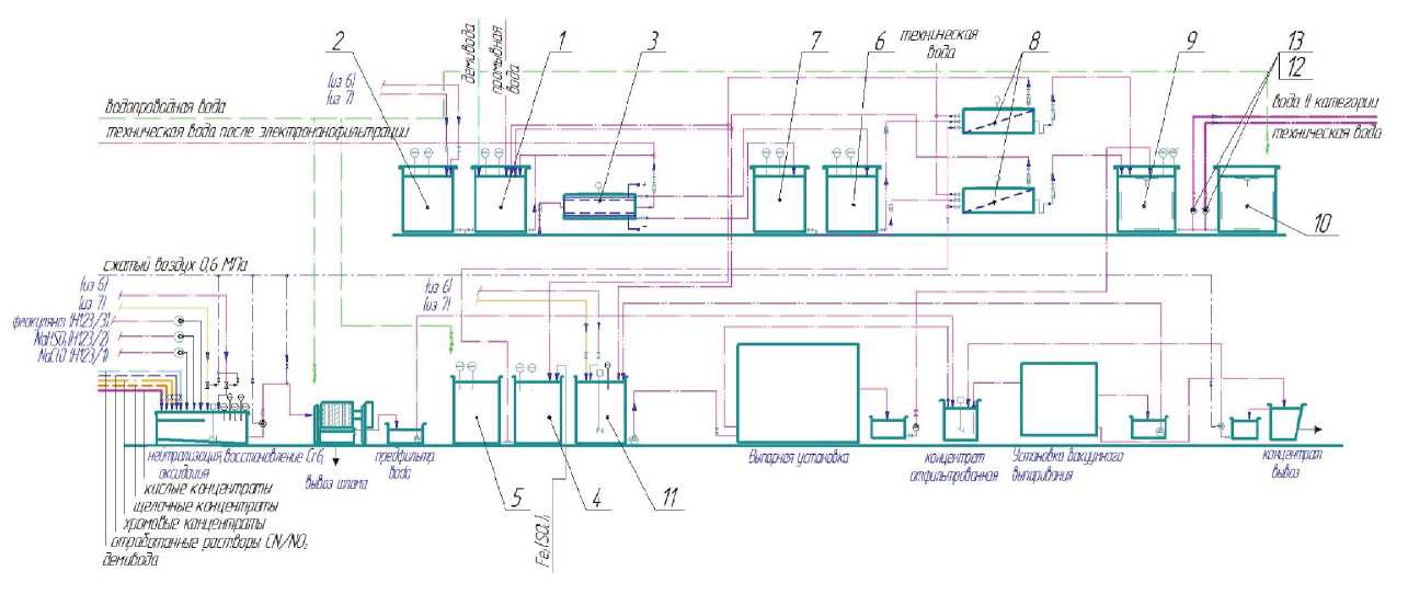 На рисунке 1 представлен модернизированный фрагмент технологической схемы комплексных очистных сооружений с установкой приготовления деминерализованной воды КОС-65 [5] на этапе обезвреживания сточных промывных вод гальванических линий с применением электронанофильтрации и нанофильтрации, а также обезвреживания концентрированных стоков.