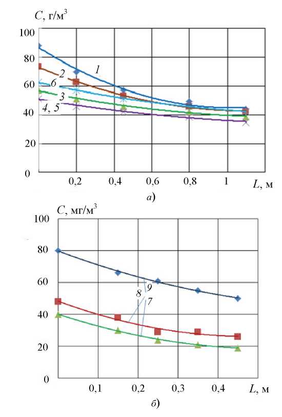 Рис. 1. Изменение концентрации СО2 (a) и СО (б) по длине контакта L: Rег = 20×103: 1 – Rепл = 110; 2 – 230; Rег = 31×103: 3 – Rепл = 76; 4 – 45; 5 – 28; Rег = 19×103: 6 – Rепл = 76; Rег = 2,2×103, Rепл = 278: 7, 8, 9 – с начальными концентрациями С0 соответственно 40, 50, 80 мг/м3