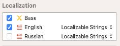 Теперь локализуем ее так же, как до этого поступали с файлом Localizable, а именно: нажмем на кнопку Localize в инспекторе объектов и выберем один из языков. Обратите внимание, что по умолчанию справа будет тип локализации "Localizable Strings", который указывает на то, что будут локализовываться только текстовые значения элементов: