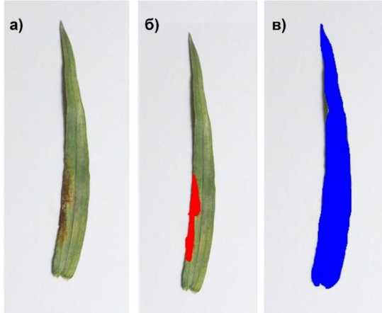 Рис. 1. Исходное изображение из полученной выборки (а) и соответствующие ему размеченные объекты: маска сетчатой пятнистости (б), маска листовой пластины (в)