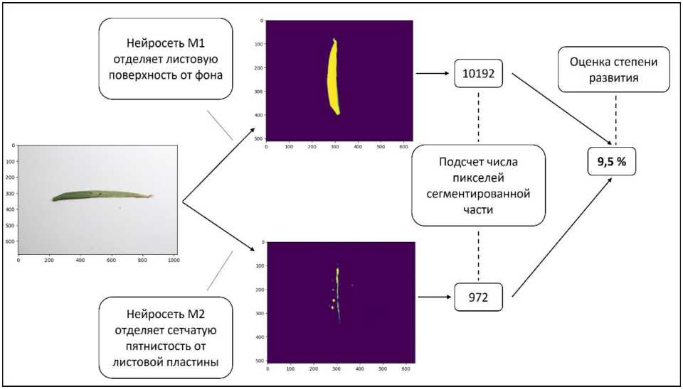 Рис. 2. Способ определения степени развития сетчатой пятнистости ячменя на основе современных методов компьютерного зрения