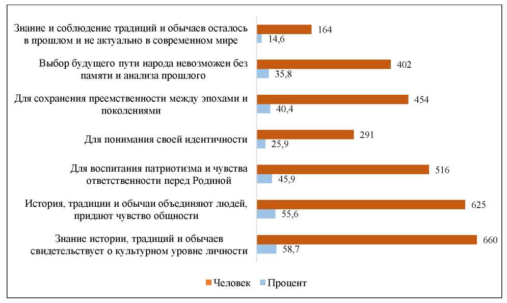 Наиболее популярным среди респондентов стал вариант «Знание истории, традиций и обычаев свидетельствует о культурном уровне личности», который составил 58,7 %. Вторым наиболее инновационным ответом стало мнение, что «История, традиции и обычаи объединяют людей и создают чувство общности» – 55,6 %. На третьем месте оказался вариант «Для воспитания патриотизма и чувства ответственности перед Родиной», который выбрали 45,9 % респондентов. Наименее популярным оказался ответ «Знание и соблюдение традиций и обычаев осталось в прошлом и не актуально в современном мире», который выбрали лишь 14,6 % респондентов (рис. 2).