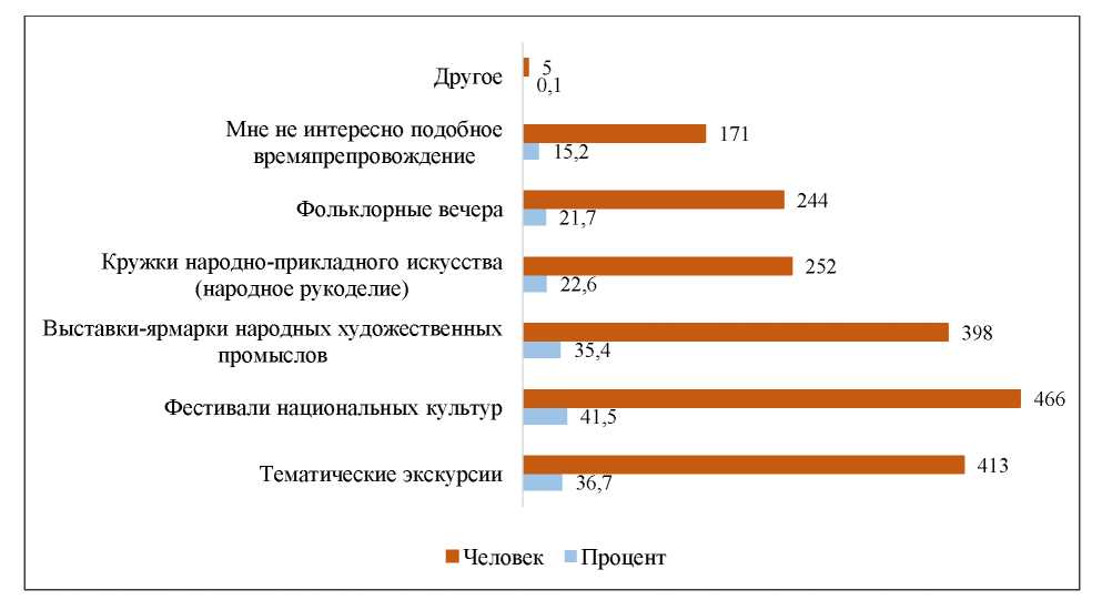 Таким образом, фестивали национальных культур являются самым популярным среди респондентов видом культурных мероприятий, за ними следуют тематические экскурсии, но есть и небольшая доля студентов, которые не проявляют интереса к подобным мероприятиям [7–9].