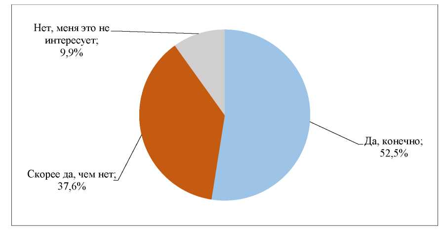 Таким образом, большая часть студентов пока нечасто встречает приглашения на мероприятия, связанные с национальной культурой, и лишь небольшая доля проявляет интерес и принимает участие в таких событиях. Однако значительное число респондентов выразили желание узнать больше о культурных и исторических достопримечательностях Кабардино-Балкарии (рис. 6).