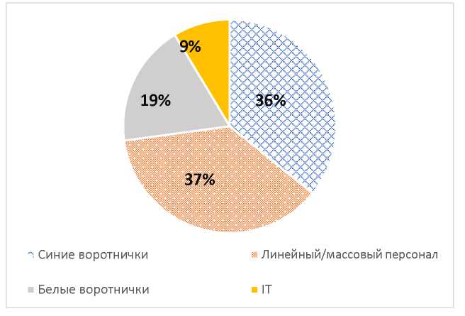 Вместе с тем к началу локдаунов 2020–2021 годов на рынке продолжала наблюдаться тенденция дефицита кадров как в инновационных сферах, так и в традиционных, в том числе импортозамещающих отраслях. Особенно дефицит касался «синих воротничков» –специалистов-производственников среднего звена и высококвалифицированной рабочей силы. Однако этот дефицит, а также другие негативные факторы (региональная несбалансированность, отсутствие регулирования в системе «спрос – предложение» и т.п.) не смогли повлиять на работоспособность рынка труда. Во многом этому способствовали меры, принятые государством (в частности, льготы специалистам в области IT способствовали относительной нормализации этого сегмента рынка), и гибкость руководителей компаний, которые реализовывали адекватные меры (например, переход на удаленку во время локдауна и адаптация дистанционной работы после пандемии), лояльность руководителей компаний к соискателям, выдвигающим свои требования, в том числе временная работа, сокращенный рабочий день, удаленная работа и т.п. Это позволило относительно сбалансировать структуру спроса. По данным агентства HeadHunter, ее можно представить следующей диаграммой (рис. 1).