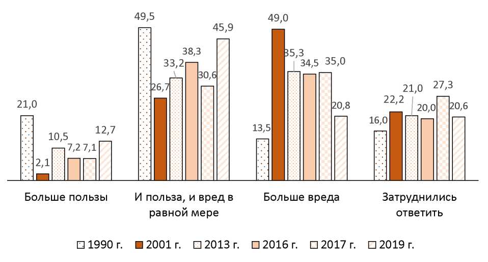 При этом уровень правового нигилизма остается достаточно высоким (хотя и имеет тенденции к активному снижению). Так, 57 % считают допустимым полное или частичное уклонение от уплаты налогов людьми, занимающимися индивидуальной трудовой деятельностью (самозанятыми). Среди самозанятых эта доля респондентов еще выше – 68 %. Более половины респондентов положительно относятся к неофициальным выплатам за работу, допускают уклонение от налогов и не считают криминальным использовать «серые» услуги (59, 55 и 57 % соответственно). Вместе с тем по оценке влияния теневой экономической деятельности на российское общество (польза/вред) выявлена положительная динамика (рис. 2).
