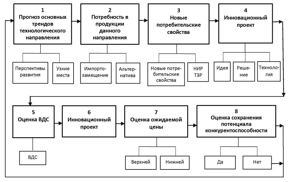 В этой модели важен третий этап, где формируются новые требования к инновационной технологии. На пятом этапе оценивается валовая добавленная стоимость, которая дает основание для назначения цены продукции (технологии), а также возможного увеличения доли оплаты труда в себестоимости продукции.