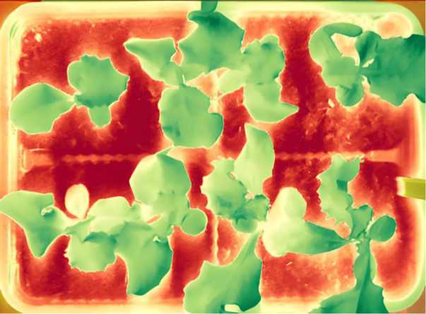 Cегментация растений салата с использованием нормализованного вегетационного индекса NDVI в дальнейшем может позволить определять параметрические характеристики салата посевного (площадь, занимаемая растениями; высота растения; количество растений). На данном этапе был вычислен NDVI (рис. 3), однако для проверки эффективности и точности в задаче сегментации необходимо дополнительно разметить выборку.