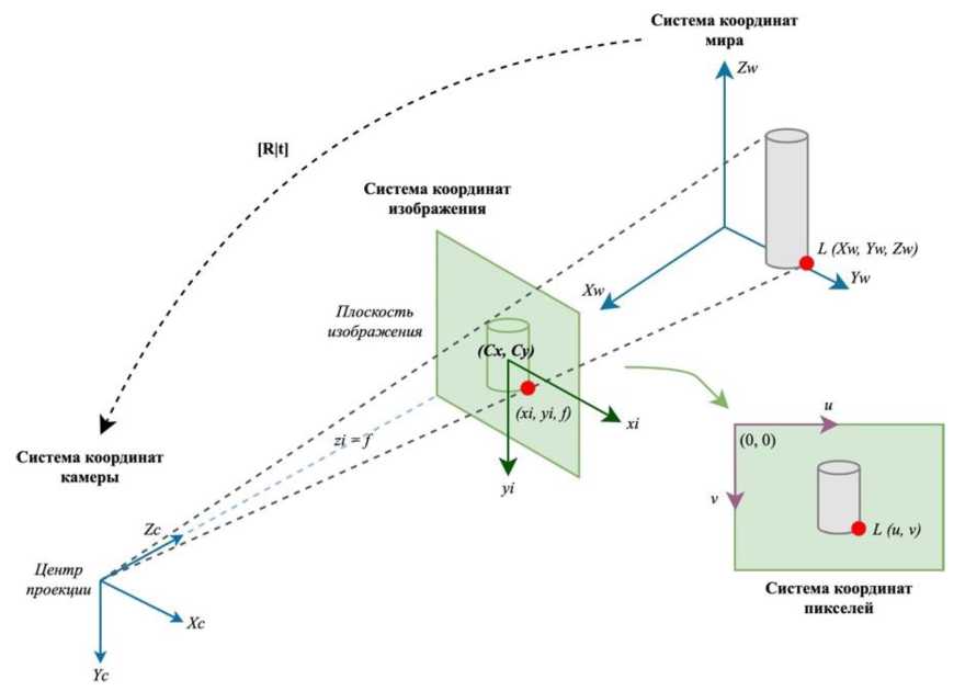 Рассмотрим модель камеры-обскуры [10], схематичное изображение которой представлено на рисунке 2. Данная модель описывает соотношение между трехмерными координатами ключевой точки в системе координат мира и ее двумерными координатами на изображении.