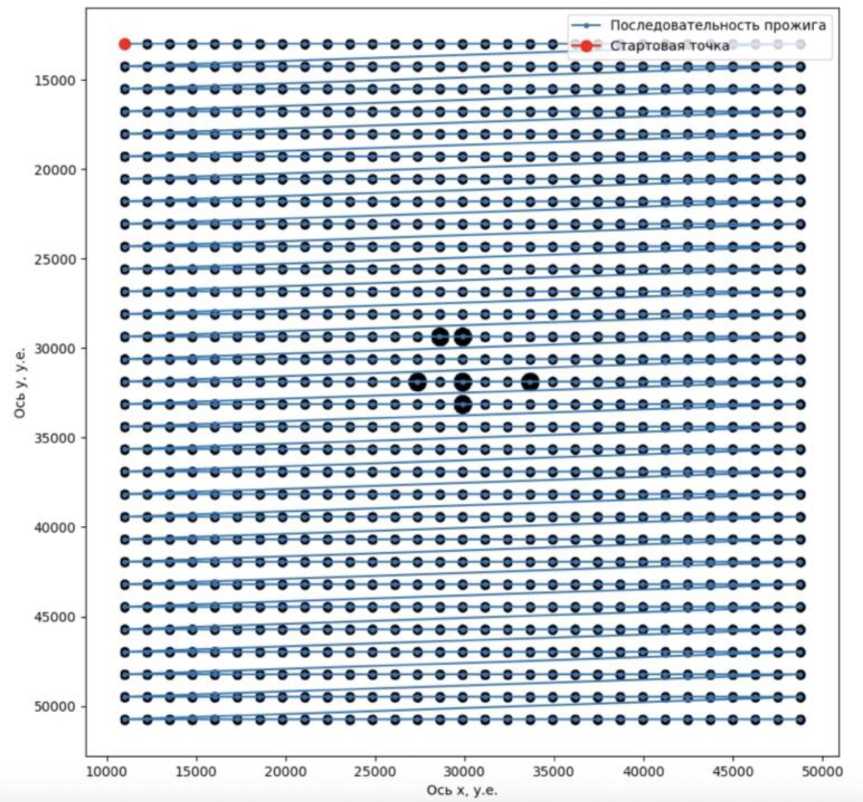 Перед началом процесса подложка, по которой будет проводиться прожиг паттерна, устанавливается на платформу построения и выравнивается относительно нуля. После этого платформа поднимается на высоту, равную высоте порошкового слоя, обозначаемой как . С использованием пилотного лазера визуализируется контур паттерна. При этом величина шага L, размер сетки N и смещение подбираются таким образом, чтобы паттерн полностью вмещался в область подложки. Далее осуществляется процедура прожига.