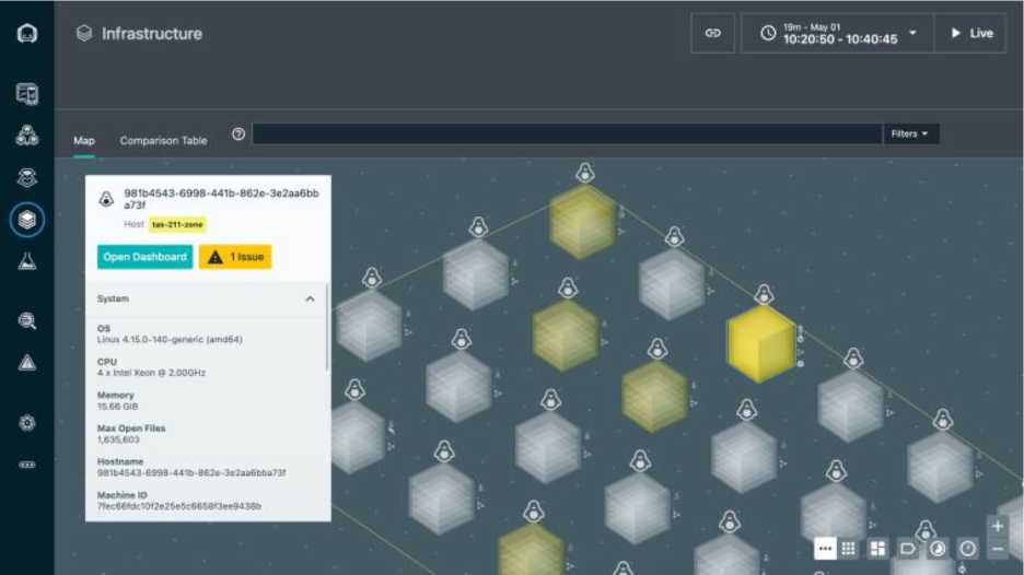 Карта инфраструктуры Instana предоставляет обзор всех контролируемых систем, что позволяет легко визуализировать каждый аспект инфраструктуры приложения. Каждый блок в столбцах представляет программные компоненты, работающие в этой системе, и меняет цвет в зависимости от любых инцидентов, событий или изменений (рис. 1).