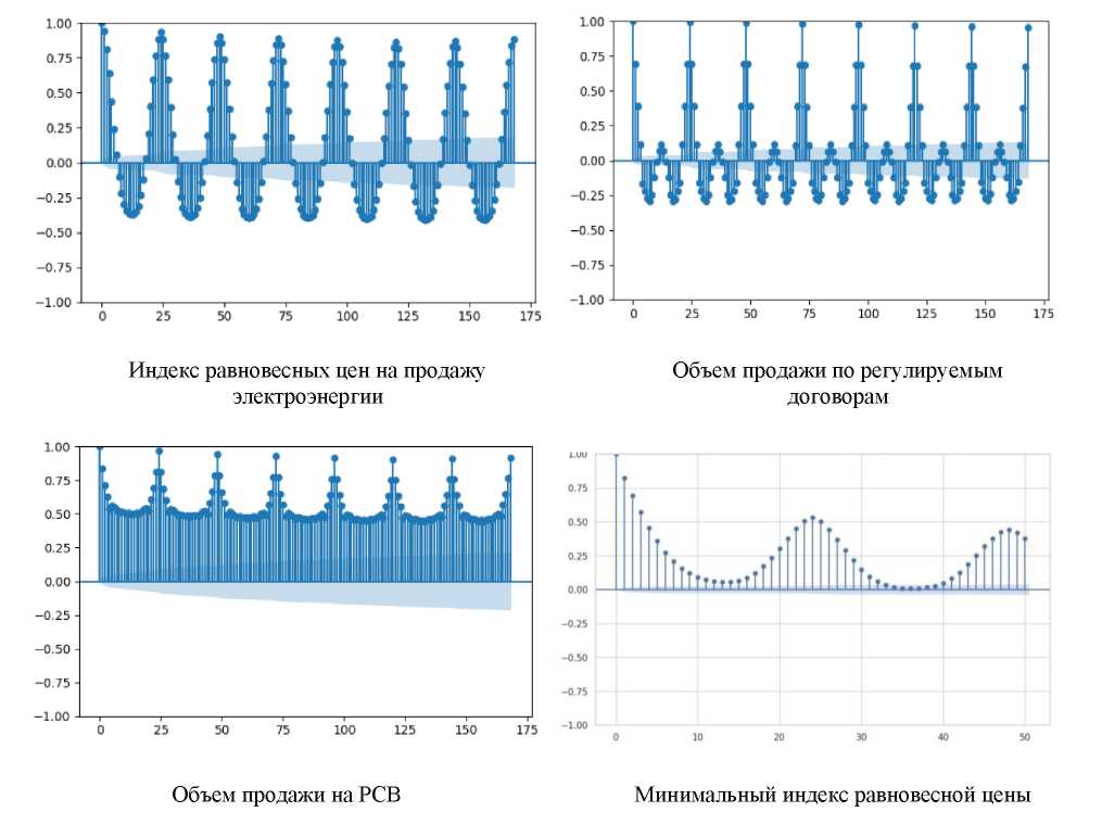 Таким образом, между объемом планового производства и индексом равновесных цен на продажу электроэнергии более выражена экспоненциальная функциональная связь, с объемом продажи по регулируемым договорам – гиперболическая связь, с объемом продажи на РСВ и минимальным индексом равновесной цены – экспоненциальная связь. Коррелограммы доминантных факторов представлены на рисунке 3.