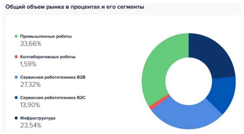В робототехнической сфере РФ в настоящее время наиболее быстро развивающимся направлением является логистика. Данное направление включает роботов-доставщиков, манипуляторов в закрытом помещении и под отрытым небом. Также следующим направлением является сельское хозяйство – дроны, роботизированные системы доения, беспилотные тракторы и др.
