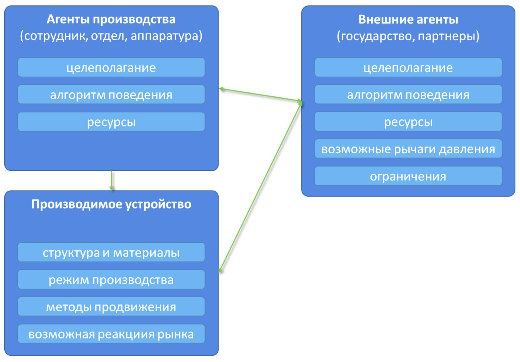 Агент производства (сотрудник, элемент оборудования или отдел предприятия) состоит из собственной системы целеполагания (не обязательно связанной с общей целью предприятия) и алгоритмом поведения. Кроме того, каждый подобный агент обладает разным набором доступных ему ресурсов, обмен которыми обеспечивает работу производственных цепочек. Вешними агентами здесь выступают государство, покупатели, партнеры и конкуренты. Внешние агенты могут обладать возможностью ограничивать работу агентов производства и иметь доступные рычаги давления, то есть возможность влияния производства на них.