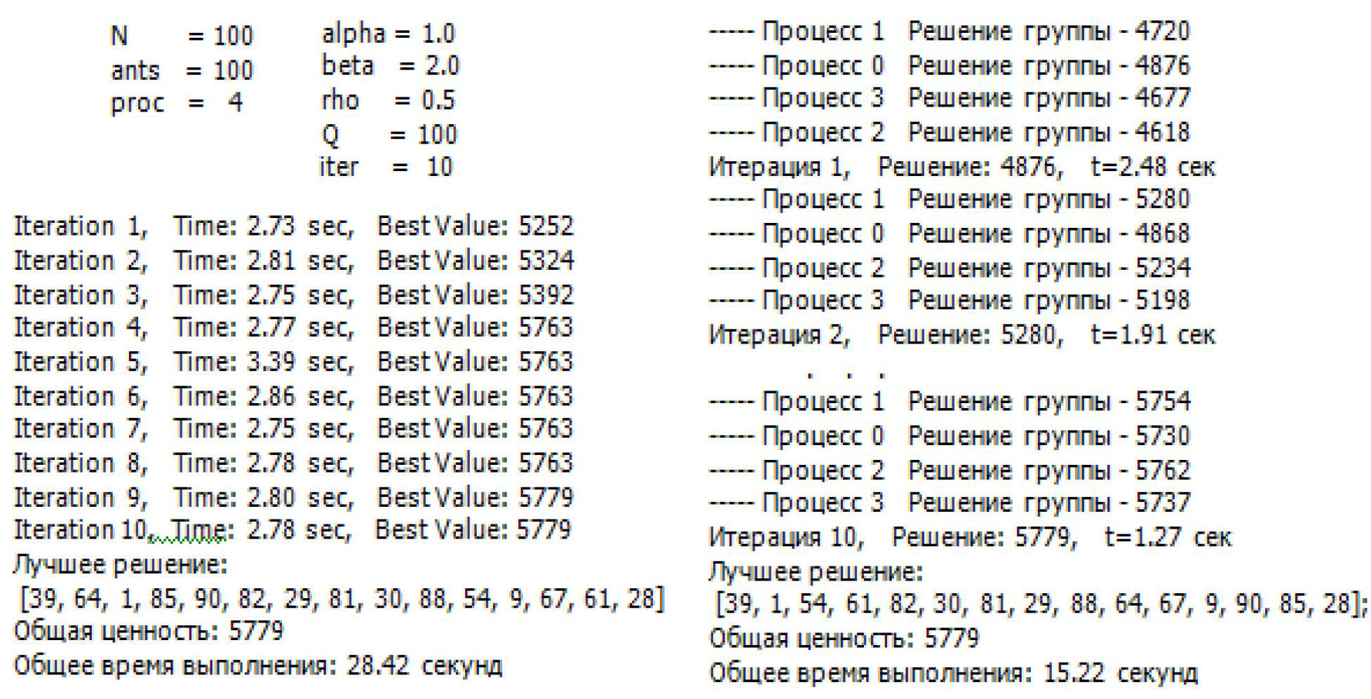 Из анализа полученных результатов следует, что параллельный алгоритм АСО значительно быстрее. Общее время выполнения составило 397 секунд по сравнению с 1415 секундами у простого алгоритма. То есть распараллеливание существенно сократило время выполнения задачи, особенно для больших наборов данных. Кроме этого, время выполнения одной итерации у параллельного алгоритма занимает от 18.45 до 23.97 секунд, что значительно меньше по сравнению с от 68.30 до 74.44 секундами у простого алгоритма. Это показывает более равномерную и эффективную обработку задач в параллельной реализации.
