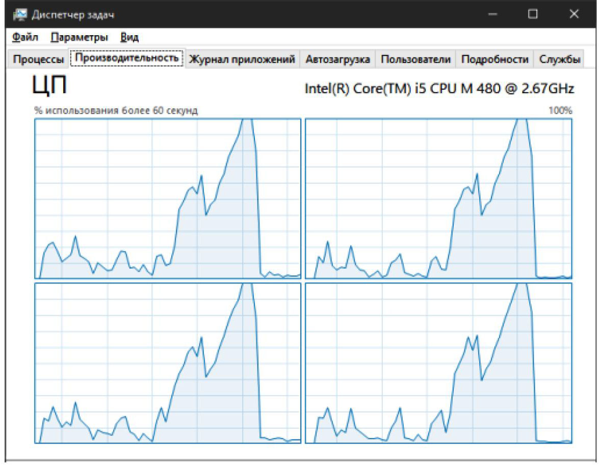 На скриншоте диспетчера задач, который был получен во время работы АСО с 1000 предметами (рис. 4), видна равномерная загрузка всех четырех ядер процессора. Из чего можно сделать следующие выводы: