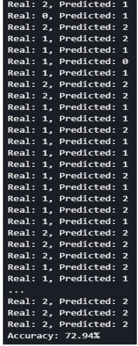 На рисунке 3 показан результат работы модели. Как видно из рисунка, точность предсказания модели равна 72,94 %, что является достаточно неплохим показателем для заданных данных. Данные для обучения и тестирования модели были взяты из кадастра селевой опасности Юга европейской части России. Подготовленный файл данных состоял из 385 строк и 7 столбцов. Первый столбец является меткой данных или классом, к которому относится заданный объект. В этом столбце 0, 1 или 2 соответственно трем типам селевых потоков (ГК – грязекаменный, ВК – водокаменный и их комбинация ГКВК). Остальные 6 полей данных являются числовыми данными, обозначающими генезис селя, площадь бассейна реки, средний уклон реки, длину реки, высоту источника, максимальный объем твердых отложении соответственно. Для обучения модели набор данных был разделен на обучающий (300) и тестовый (85) наборы. Размер сетки нейронов в данной работе равен 5 х 5, количество итераций при обучении – 1000, начальная скорость обучения – 0.3, начальное состояние весов случайное в диапазоне от 0 до 1.