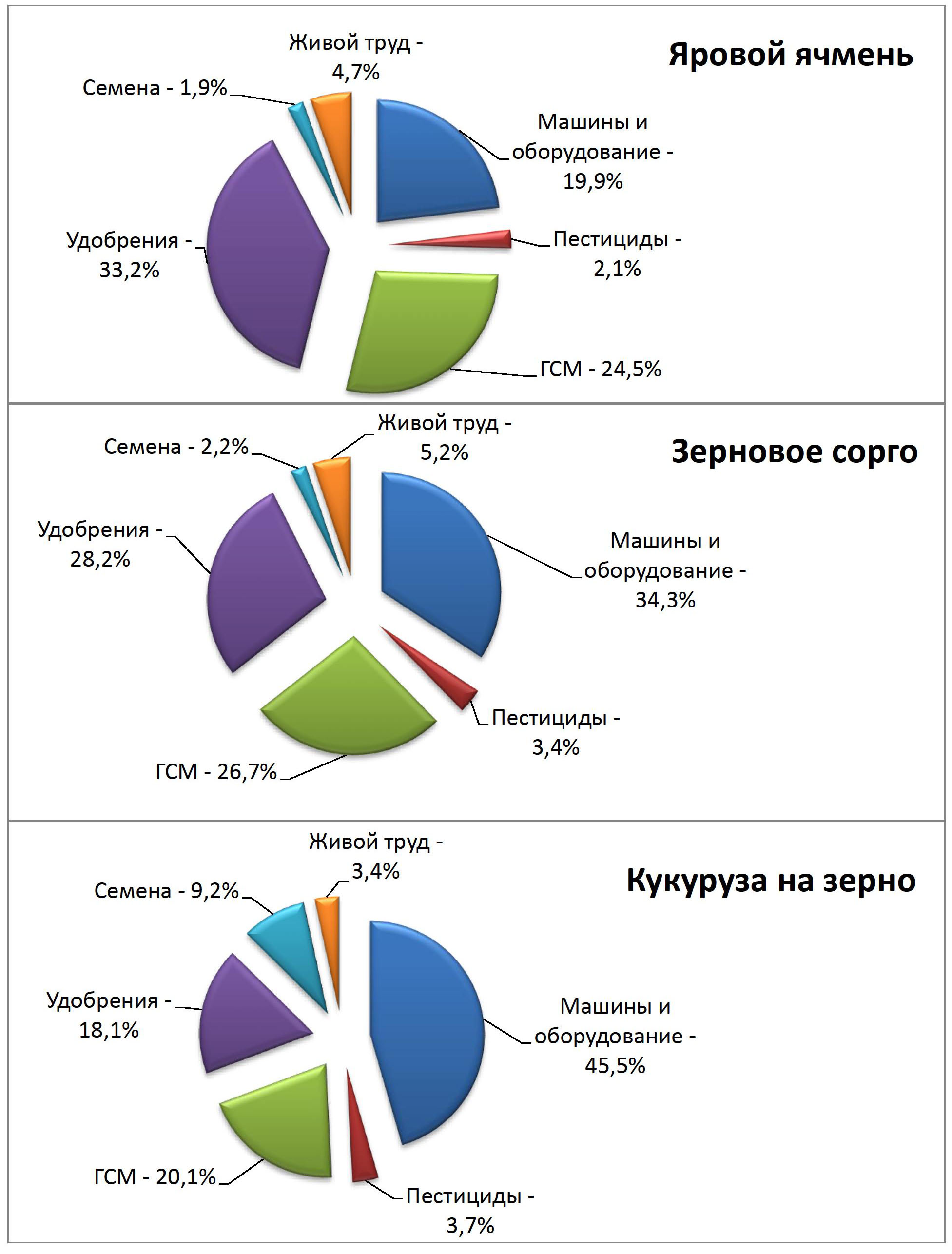 В структуре энергетических потоков при производстве зерна ярового ячменя максимум приходился на применение удобрений (33,2 %) и горюче-смазочных материалов (24,5 %). При производстве зернового сорго заметно возрастала доля энергетических потоков, переносимых на продукцию машинами и оборудованием (34,3 %), что связано с резким ростом затрат энергии на послеуборочную доработку – очистку и сушку зерна (14,3 % от всех валовых энергетических затрат в технологии возделывания культуры). При этом доля энергозатрат на применение удобрений снизилась до 28,2 %, а на использование ГСМ – до 26,7 %. При выращивании кукурузы доля затрат совокупной энергии, переносимой на продукцию машинами и оборудованием, достигла 45,5 %, что вызвано значительным их увеличением на очистку и сушку убранного зерна до базисных кондиций.