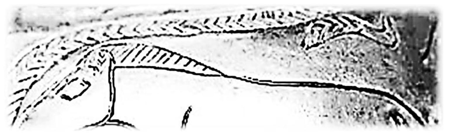 Рис. 5. Фрагмент сосуда. Оперение водоплавающей птицы и поверхность русла реки автор выразил одинаковой штриховкой (в «елочку»)