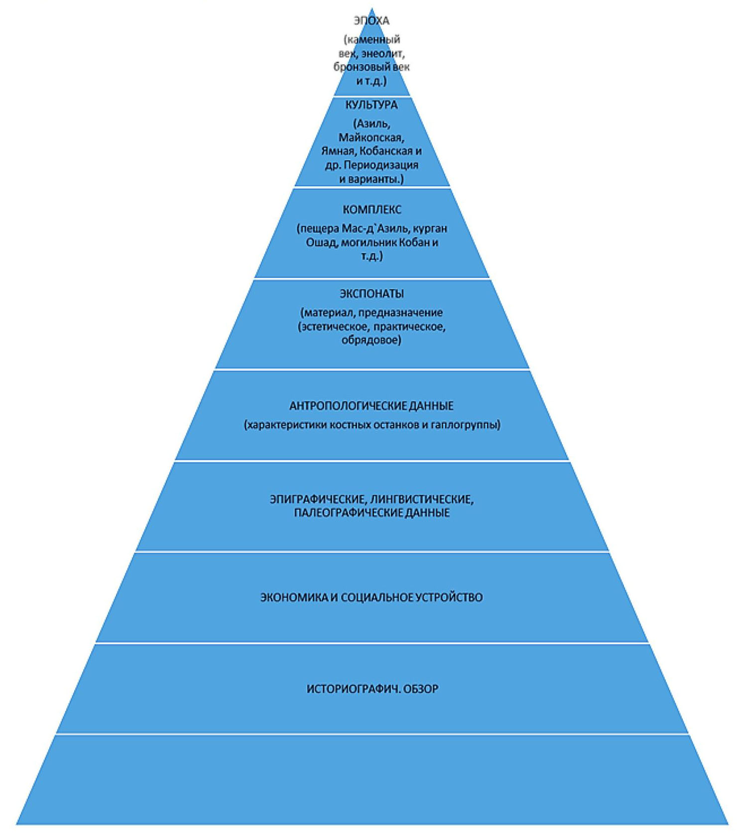 Если речь идет об археологической экспозиции, то ее структура, от вершины к основанию пирамиды, может выглядеть так: